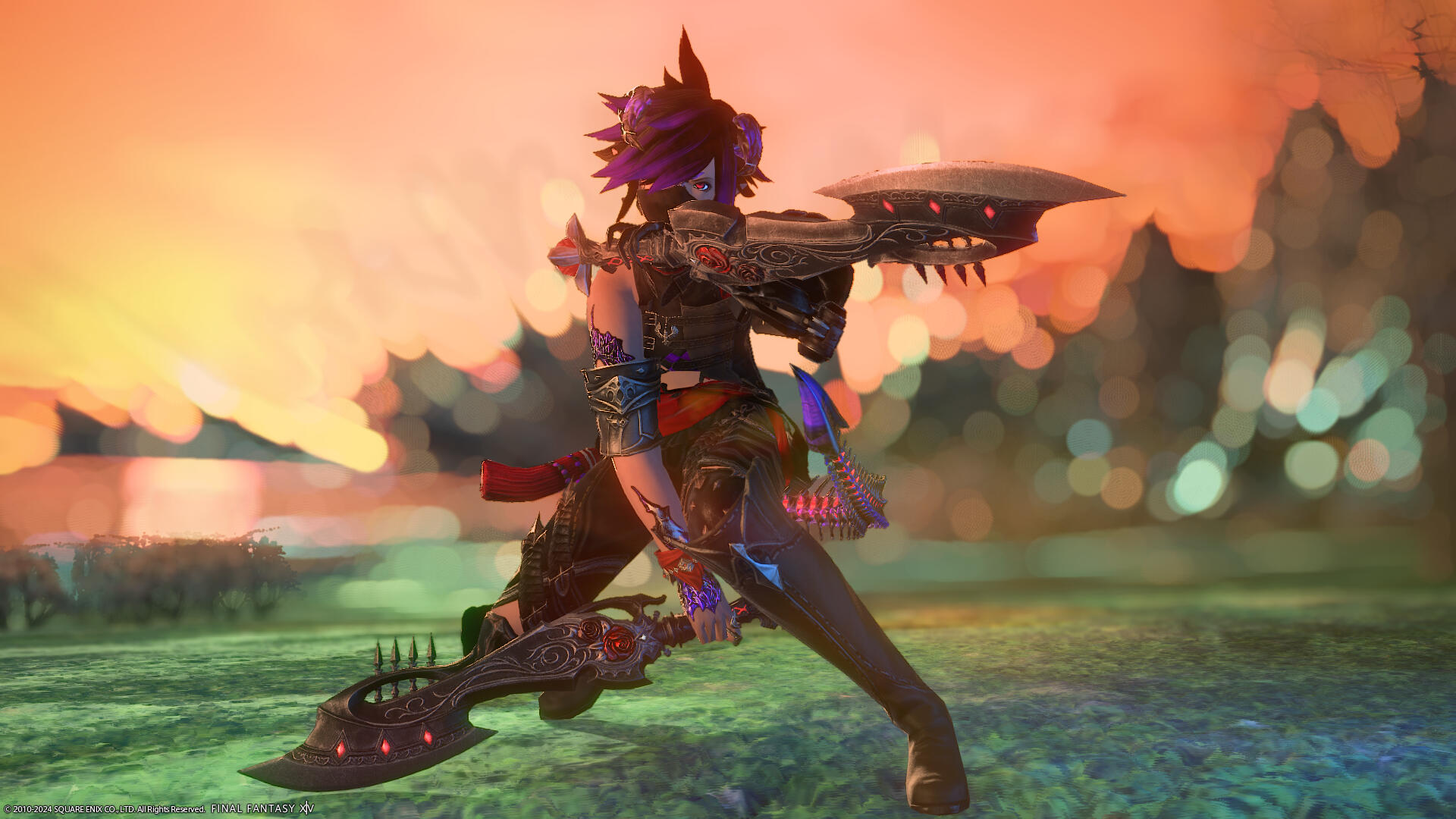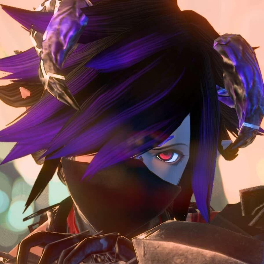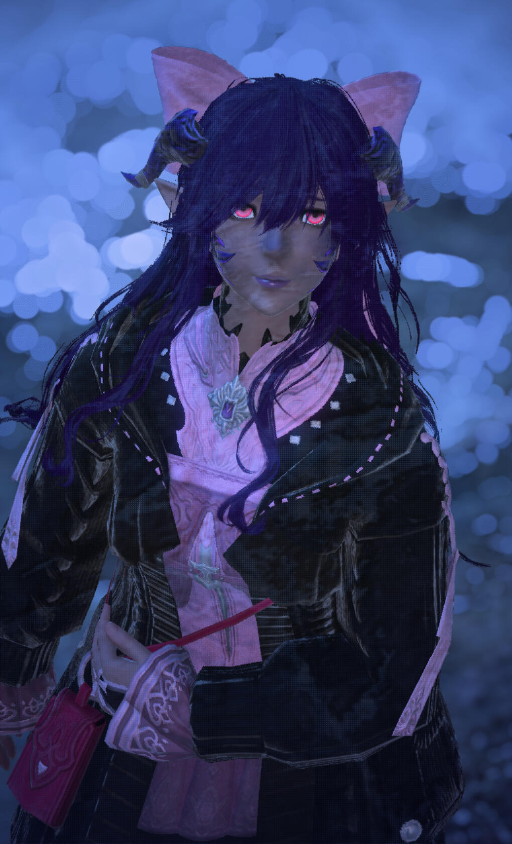 | specific features | purple scales marks on scales and horns, elezen ears in addition to xaela horns, mechanical left arm, mechanical tail with scarlet lights in it. |
