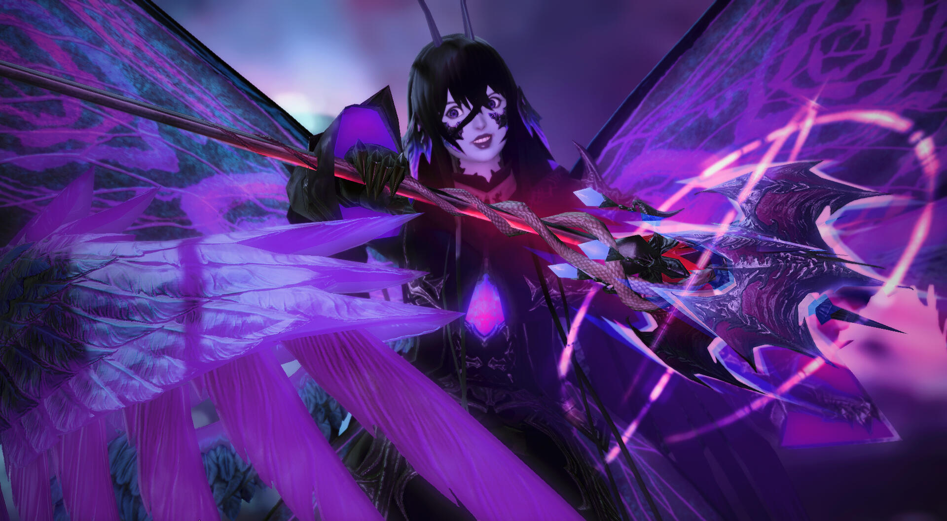 | specific features | luminescent moth-like wings with one pair of bird-like wings in between. luminescent, defined irises. purple horns and scales. pitch black, insectoid limbs. sharp canines. luminescent crystalline core. |